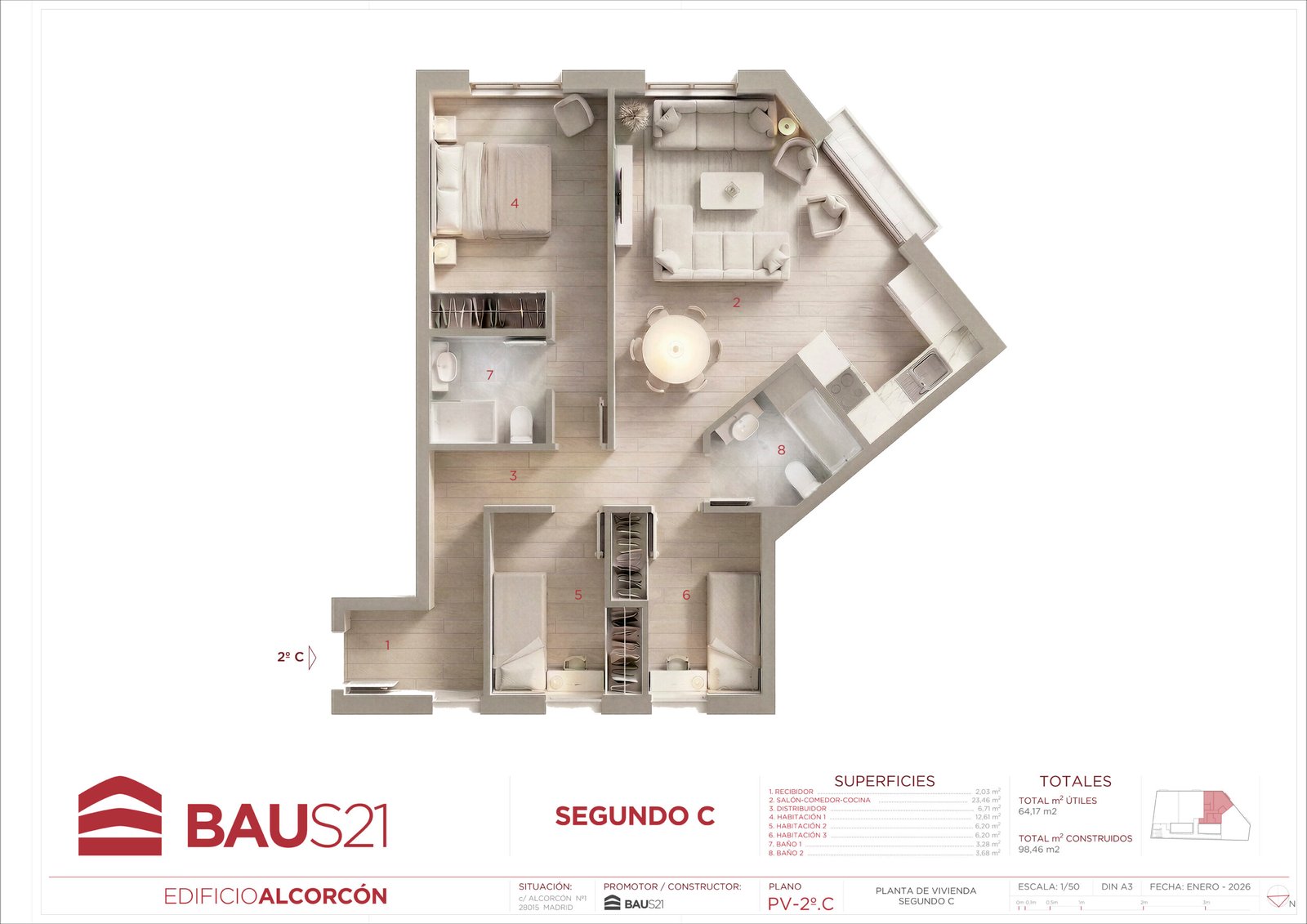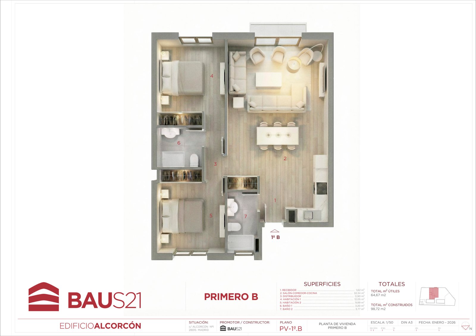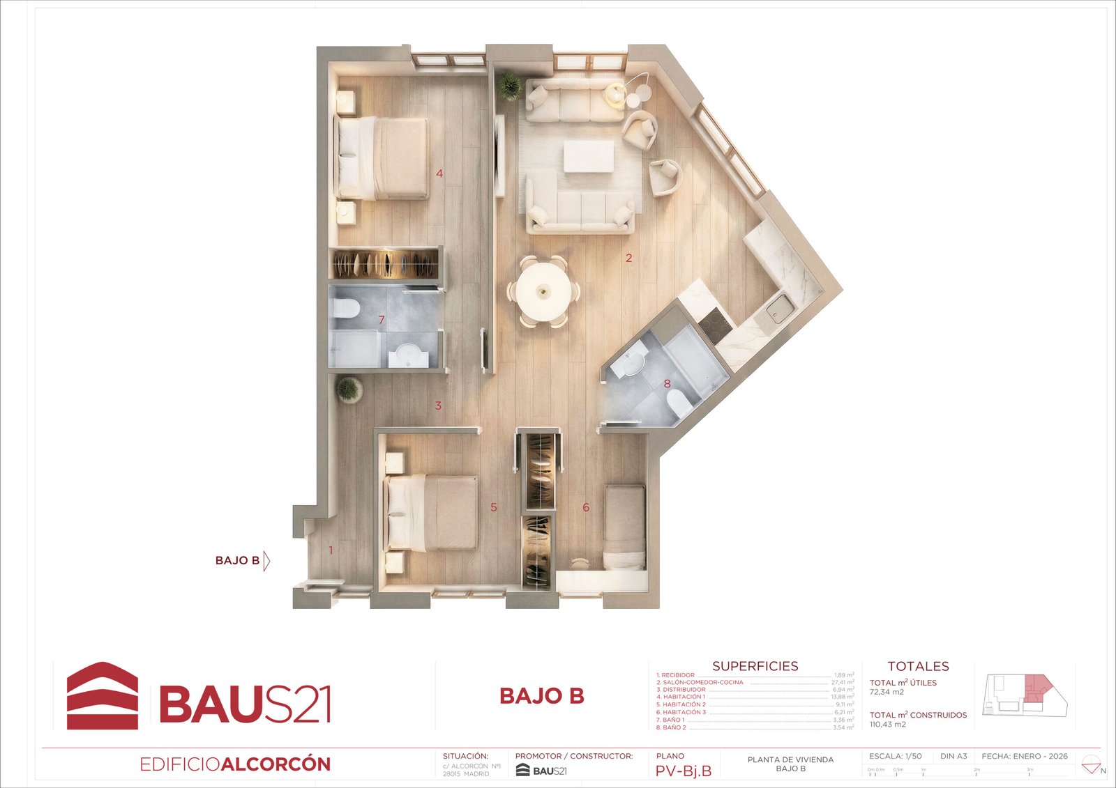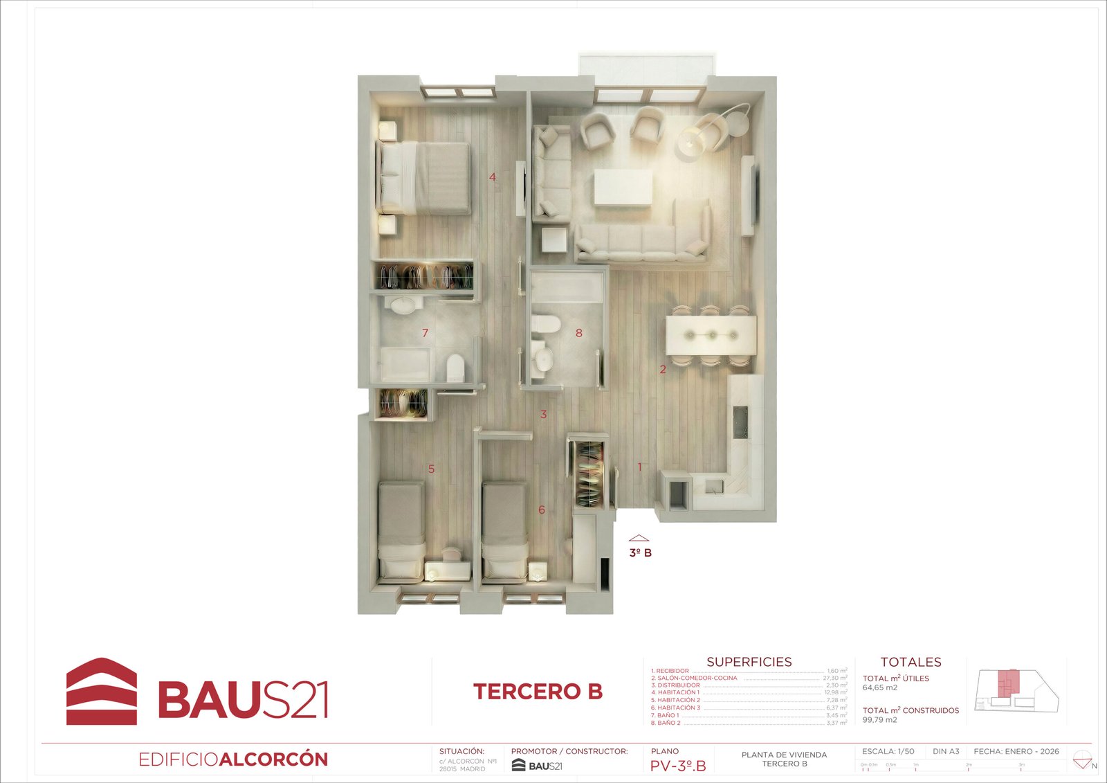 • 3 Dormitorios (con posibilidad de conversión a 2).