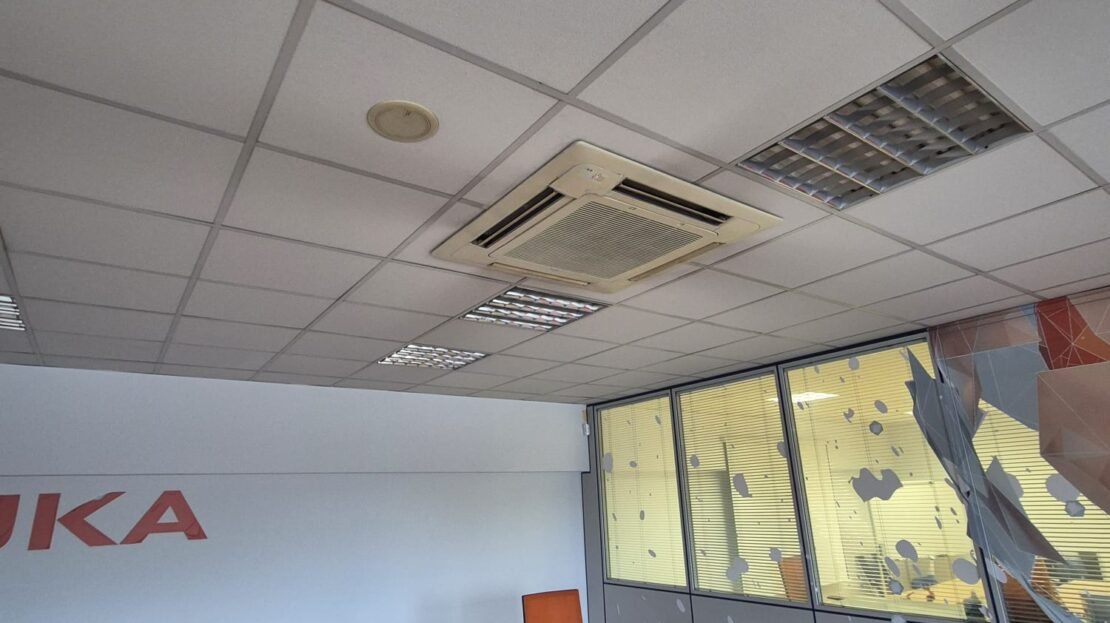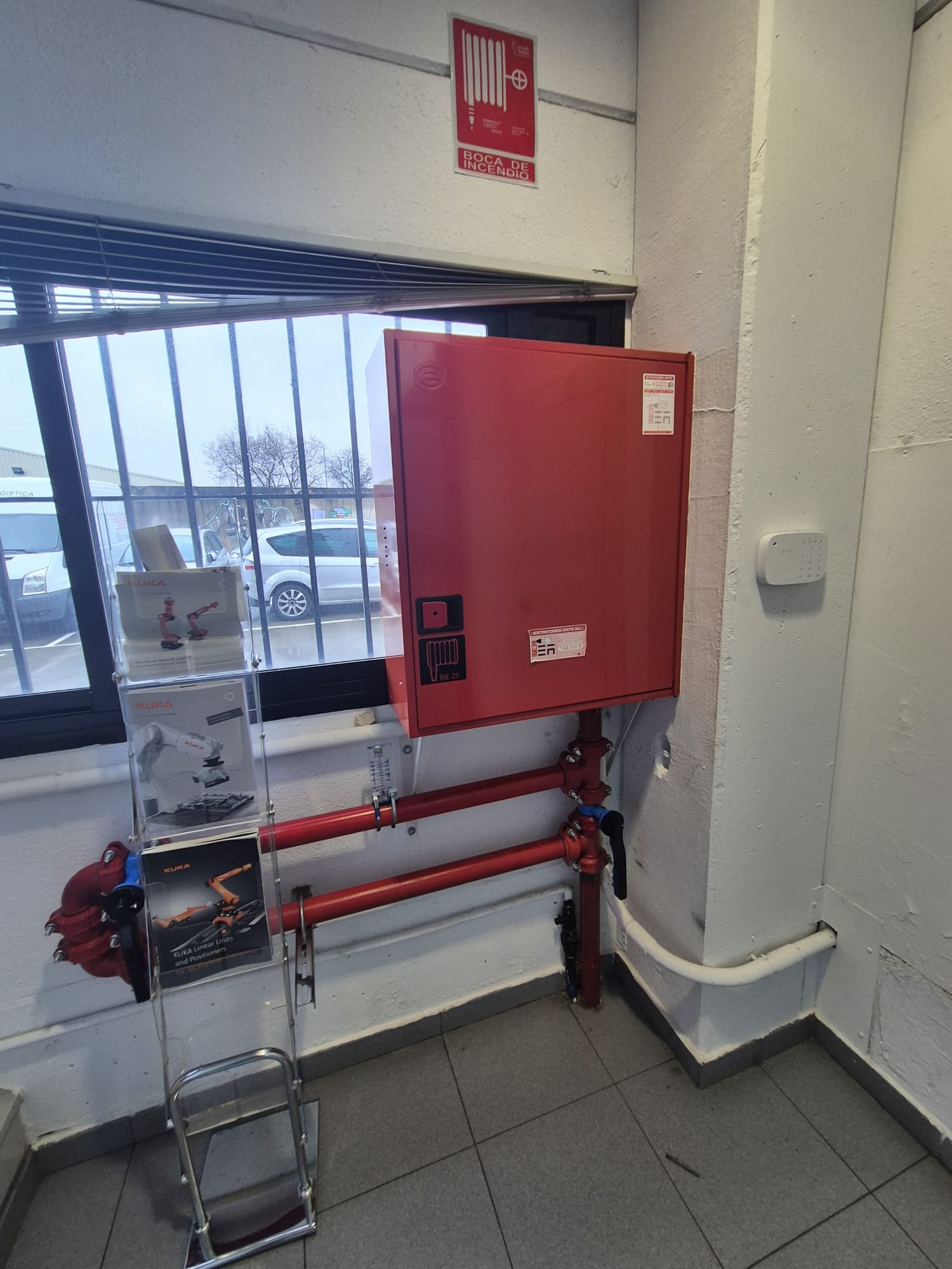 Aire acondicionado en ambas plantas, sistema de fuerza, sistema antiincendios BIEs, alarma, iluminación mediante fluorescentes, suelos de gres en planta baja y tarima en planta alta, puerta basculante con pivotes de seguridad, puerta lateral para vehículos, patio.